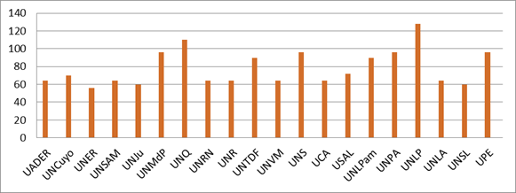 En el eje de las abscisas de la Figura 1 se presentan todas las universidades que dictan materias de Administración General en carreras vinculadas al turismo y en el eje de las ordenadas se encuentra la carga horaria que poseen estas asignaturas. Como puede visualizarse previamente, la UN de La Plata y la UN de Quilmes son las que ofrecen mayor cantidad de carga horaria en sus programas (128 y 110 respectivamente).