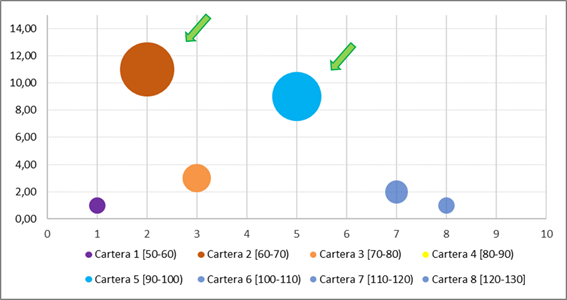 En la Figura 2 se confeccionan carteras (o grupo) de asignaturas de Administración General vinculadas a carreras de turismo, de acuerdo con la carga horaria que poseen. En el eje de las abscisas se presentan los rangos de carga de horas de las asignaturas relevadas. En el eje de las ordenadas, la cantidad de materias que se corresponden con cada rango.